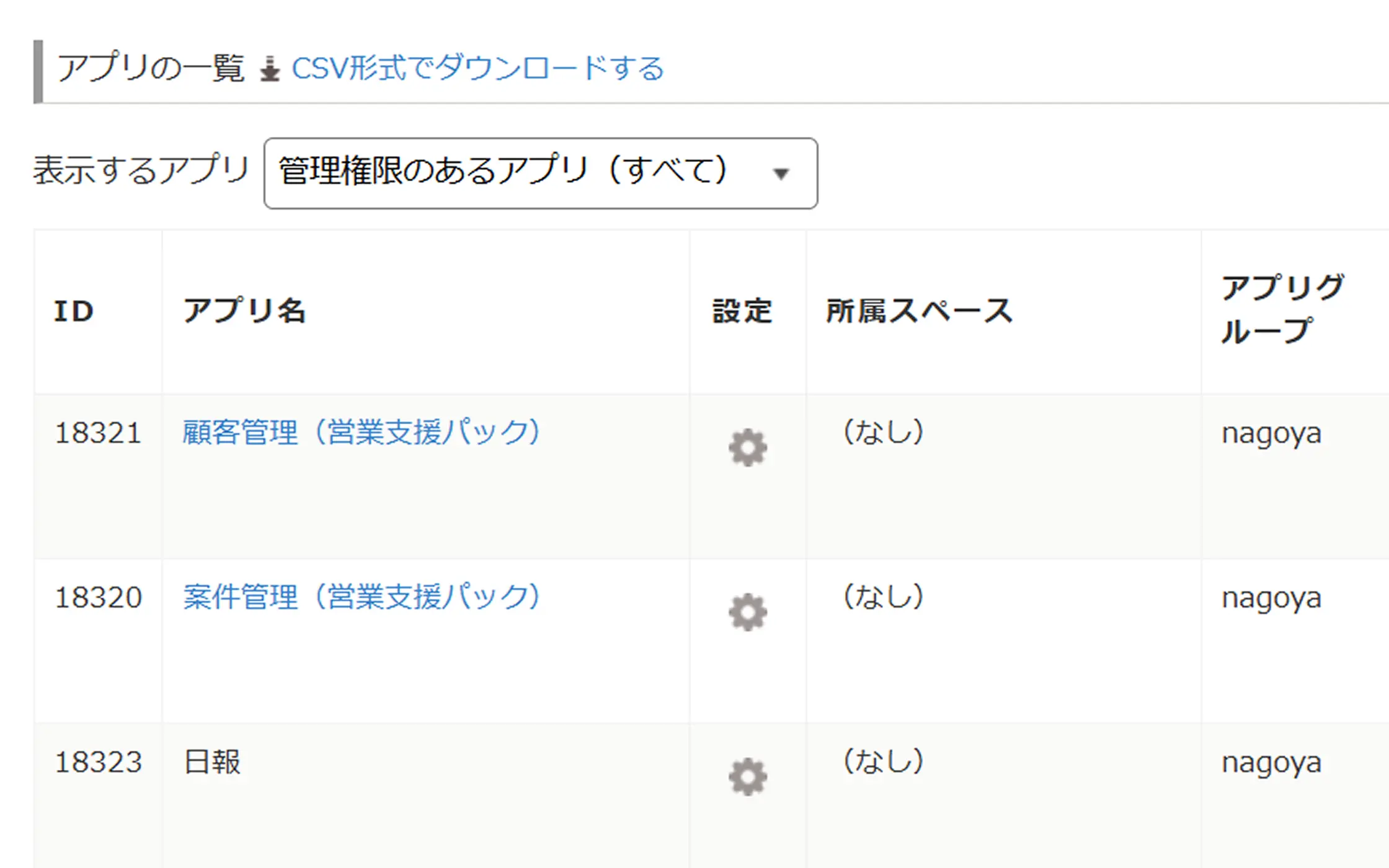 社内のアプリの一覧を確認できます。更新がないアプリやデータ量が多いアプリなどを発見し、アプリの作成者や更新者を確認して棚卸しするといった運用に使えます。