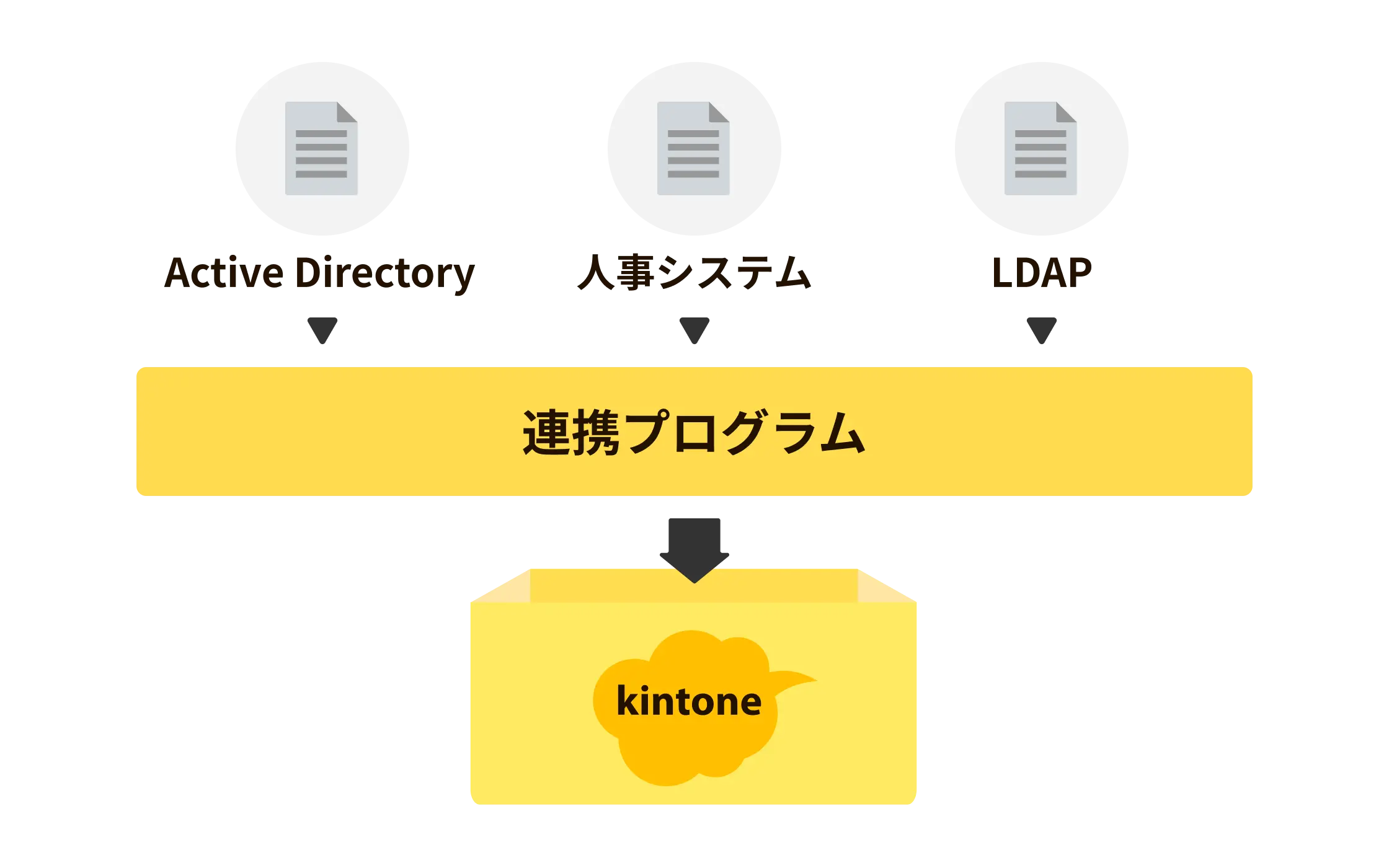ユーザー情報APIを活用することにより、社内に設置されているActive Directory / LDAPサーバーなどの人事マスタシステムとキントーンのユーザー情報を一元管理できます。組織変更に伴うシステム管理者の負担を大きく減らします。