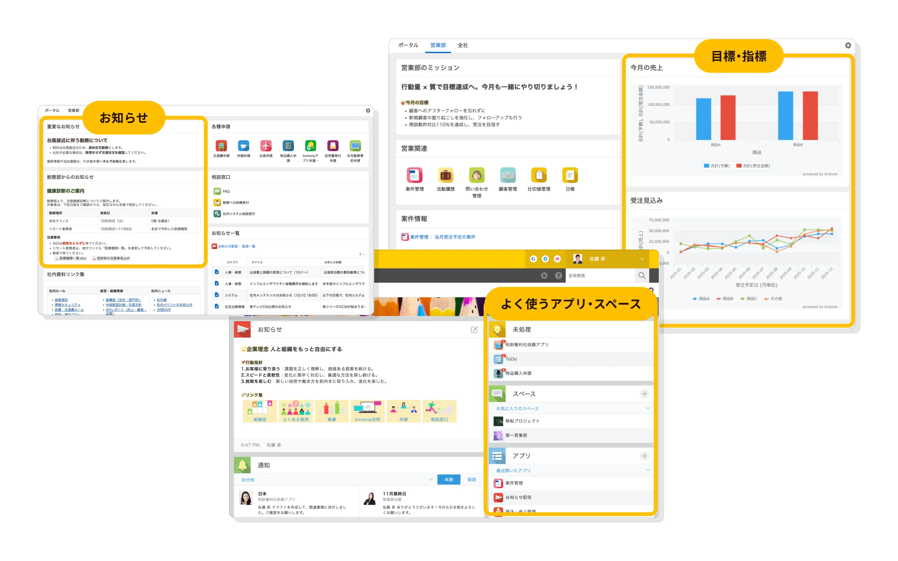 ポータルは、キントーンにログインすると最初に表示されるページです。お知らせや社内ルール、よく利用するアプリなど、業務に関わる情報をまとめて掲載でき、業務のスタート地点として活用できます。