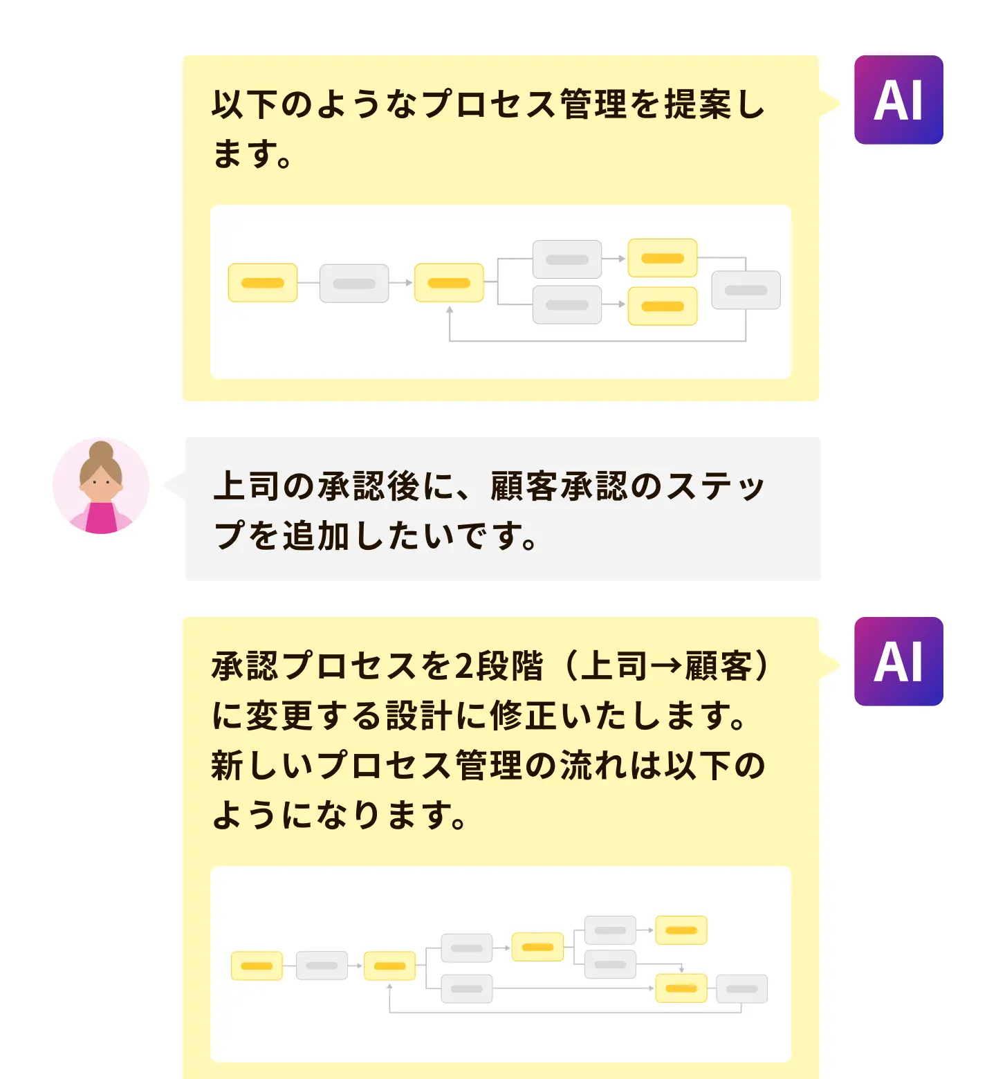 「やっぱりこうしたい」と思ったときも、AIに伝えるだけでフロー図を見ながらすぐに修正可能。柔軟に調整できるので、納得できる設定ができます。