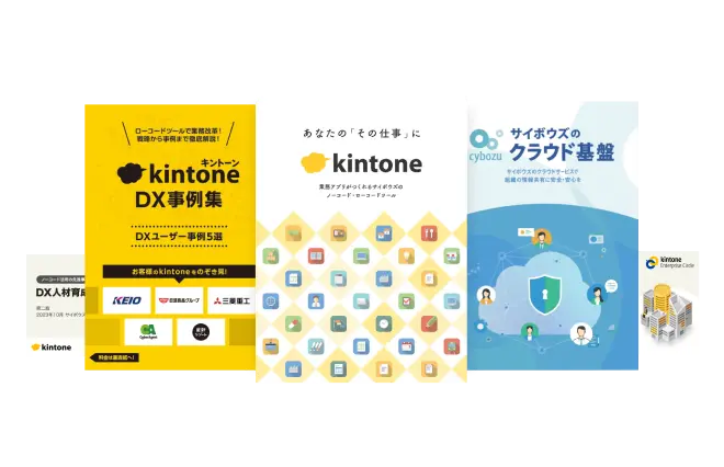 他企業でのDX事例から、kintoneの概要やセキュリティ、ノーコードツールを用いたDX人材育成やガバナンス構築の勘所をまとめた資料セットです。