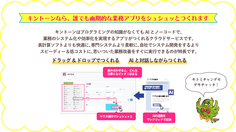 キントーンは、思いついた業務改善をすぐに形にできるのが特長。