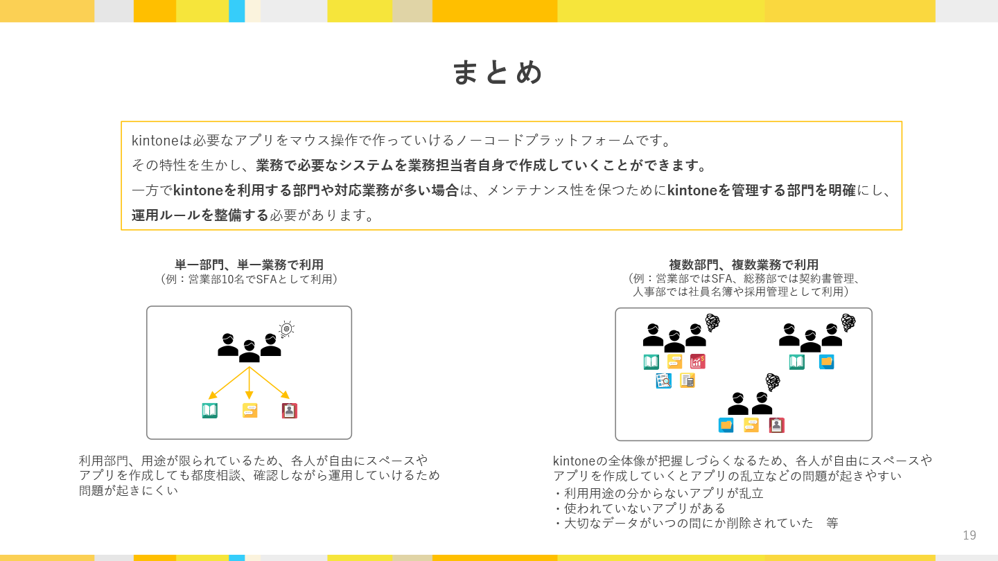 以下はkintoneの運用ルールを策定する際の参考資料として考慮すべきポイントをまとめた資料になります。