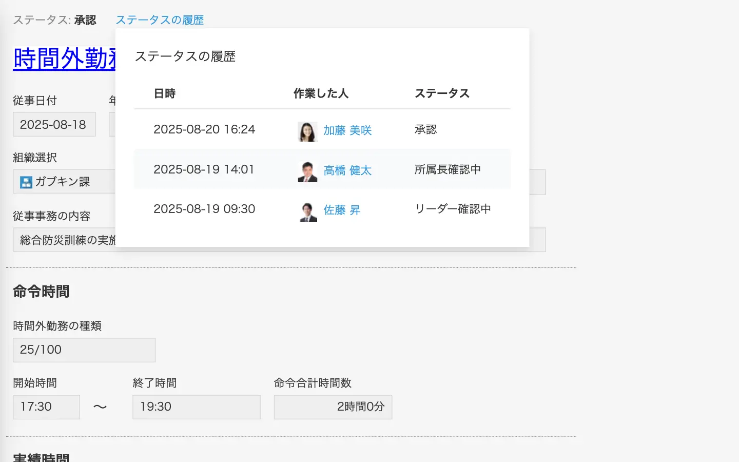 時間外勤務を管理できます。各課の実績が自動で入力されるので、集計の手間も削減できます。