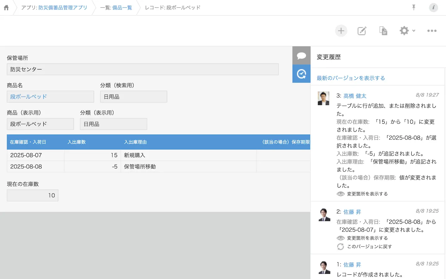 防災備蓄品の在庫管理をkintone上で行うことができます