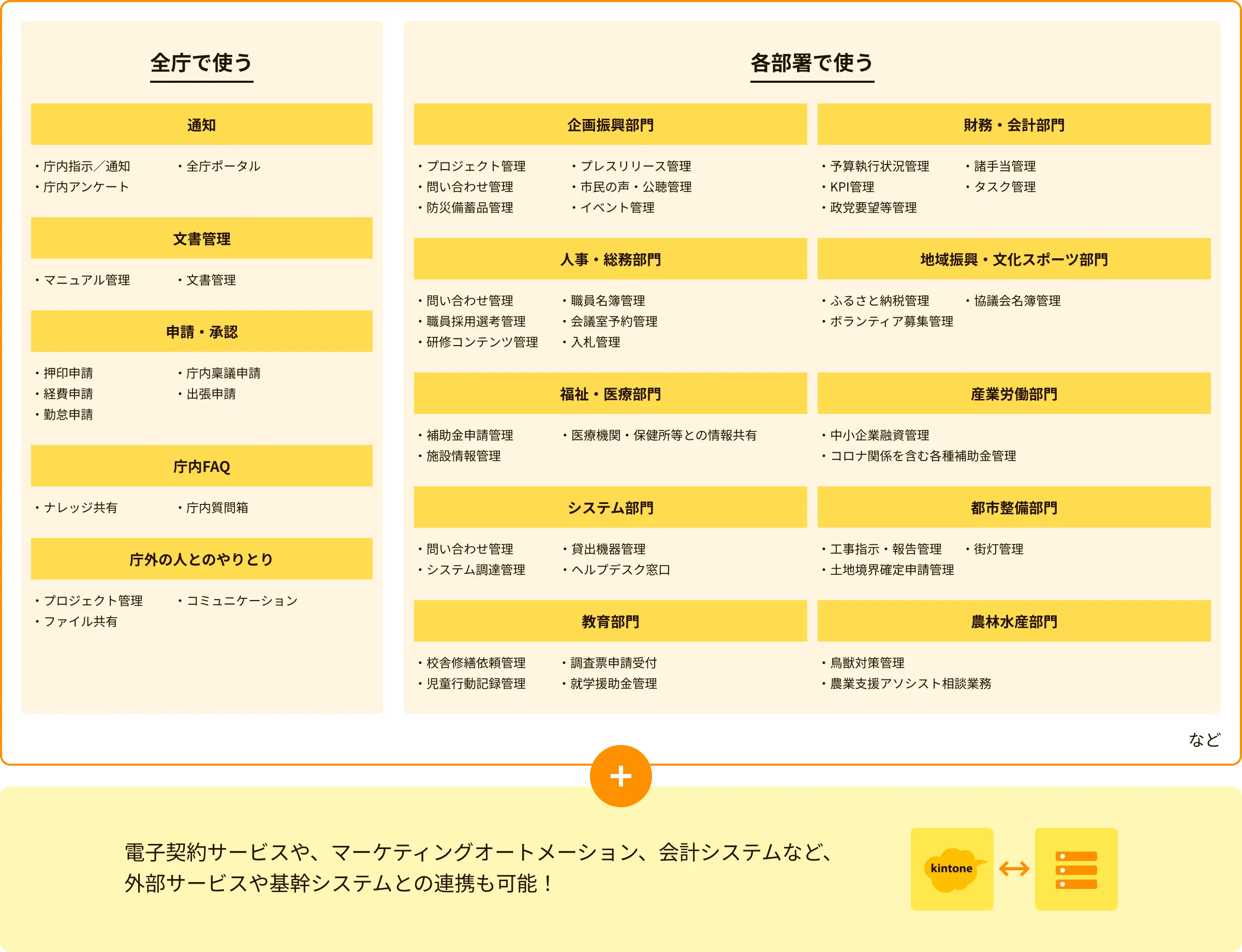キントーンは各部門の業務改善から全庁での業務改善まで、自治体のあらゆる用途で利用できます。