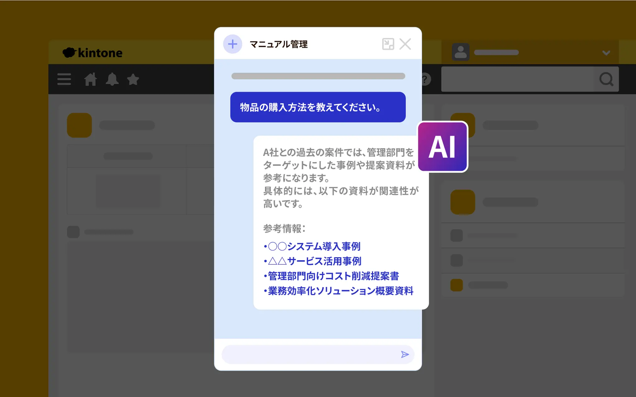 キントーンに添付したマニュアルや規定集などのファイル情報も含め横断検索してAIが回答を作成できます。