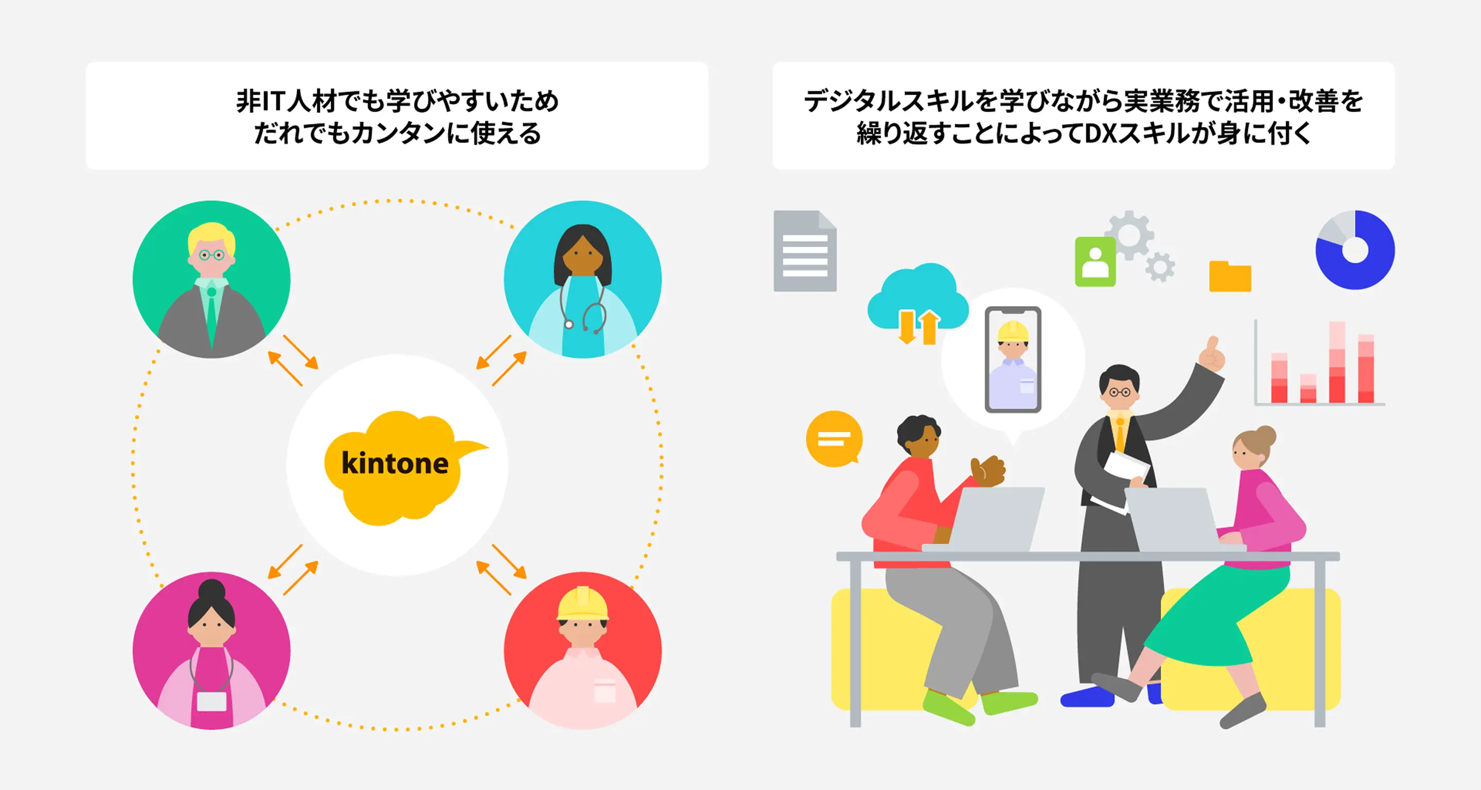 キントーンなら誰もがかんたんに使える環境で、実業務に取り組みながらDXスキル育成を実現できます。