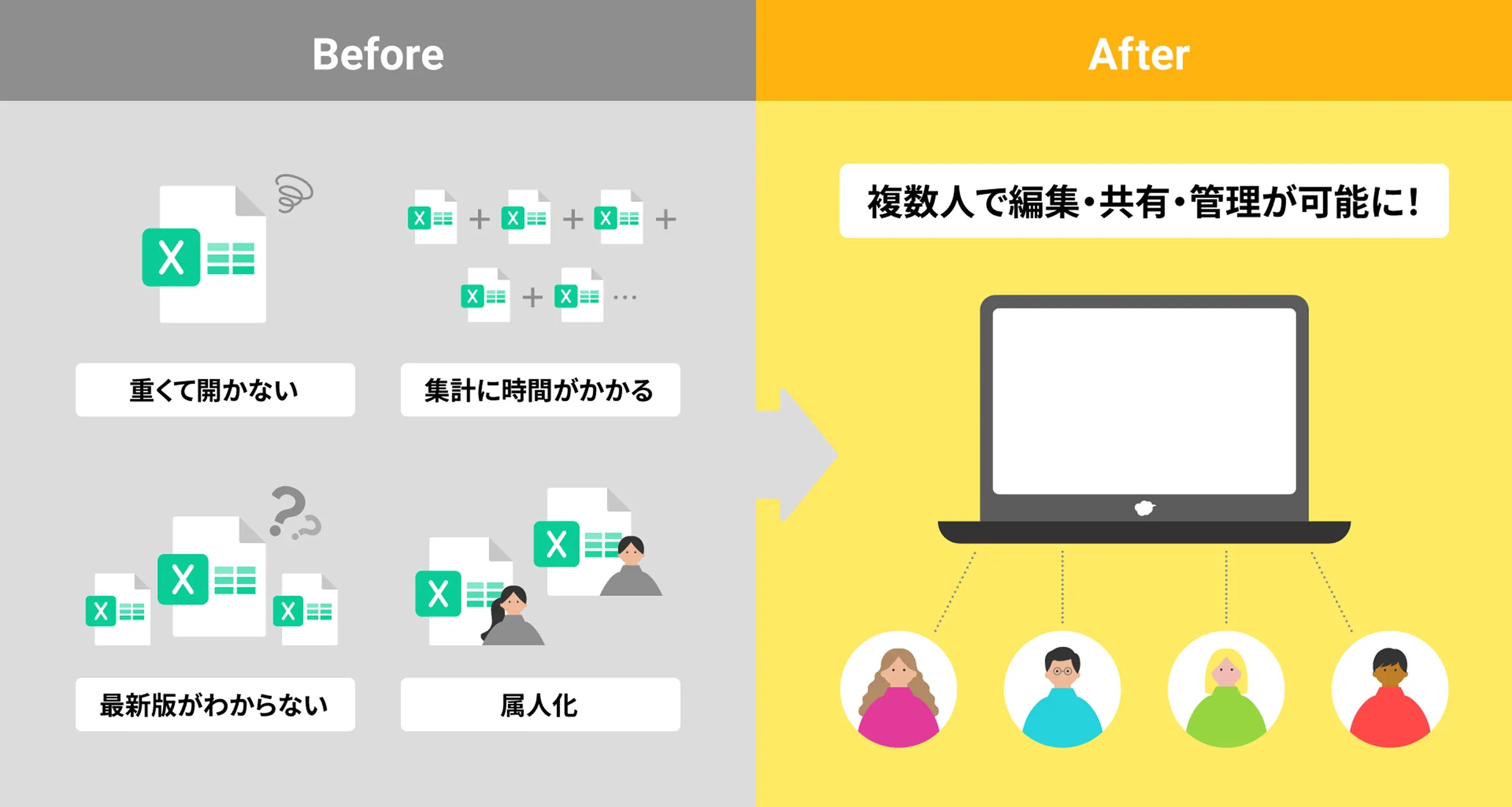 属人化したExcel、重くて開かないExcel、集計作業に時間がかかるExcel、最新版がわからないExcelなど、