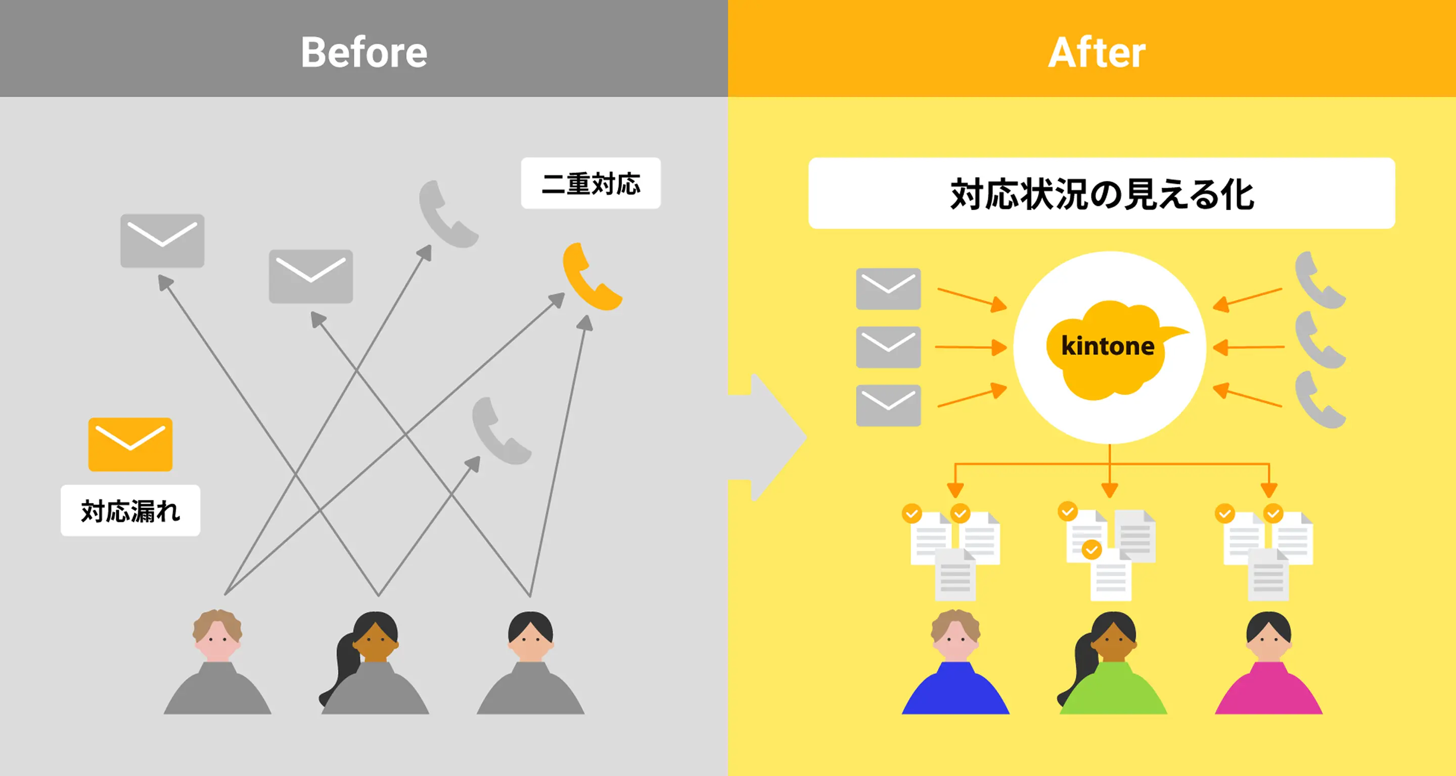 - kintone上で、対応状況や担当者を設定し、全体管理を見える化できます。