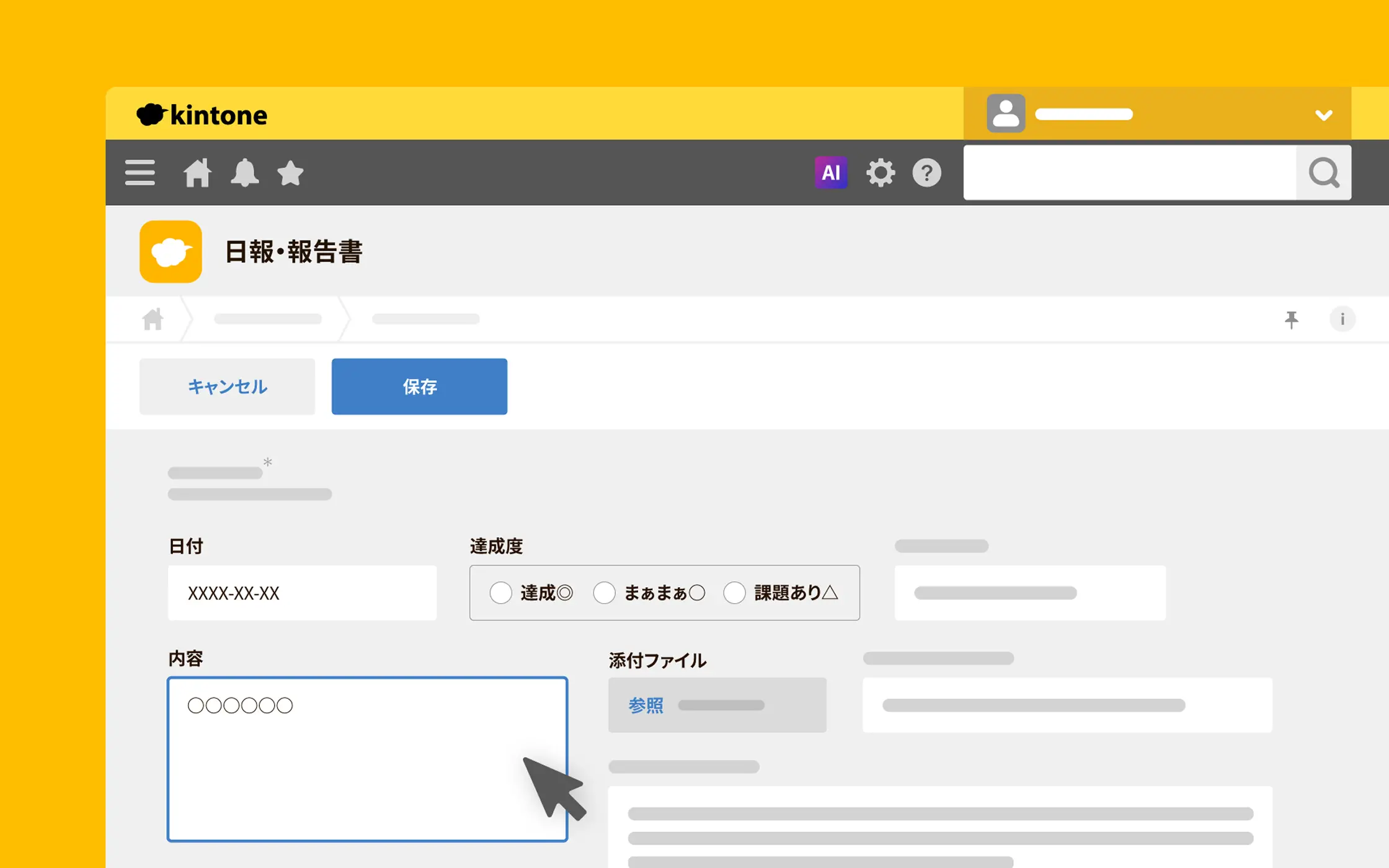 - 「日付」「作成者」「業務内容」など自社の業務に合わせて必要な項目を自由に設定できます。