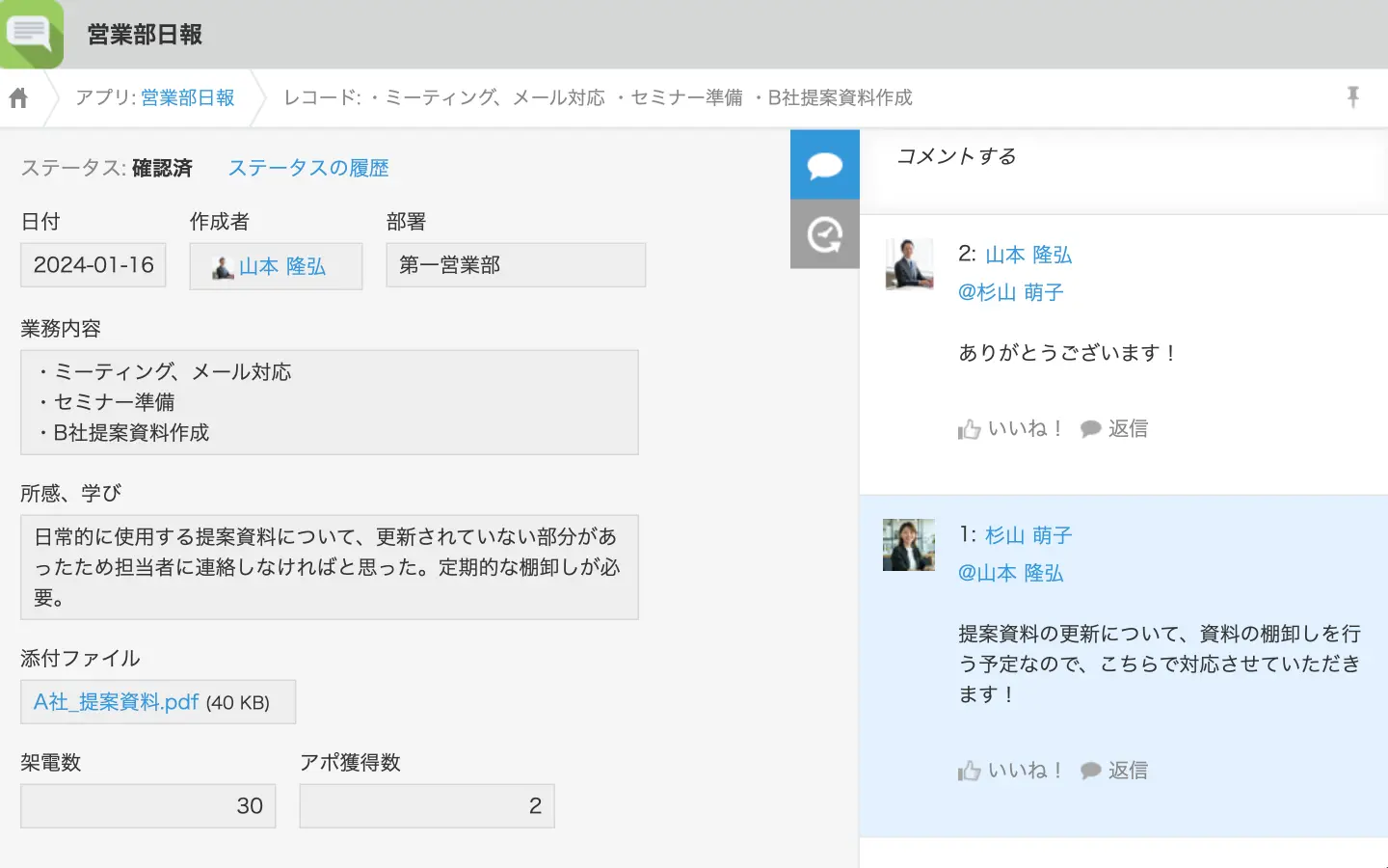 - メンション機能で特定の担当者に通知し、個別具体的な指導もスムーズ。