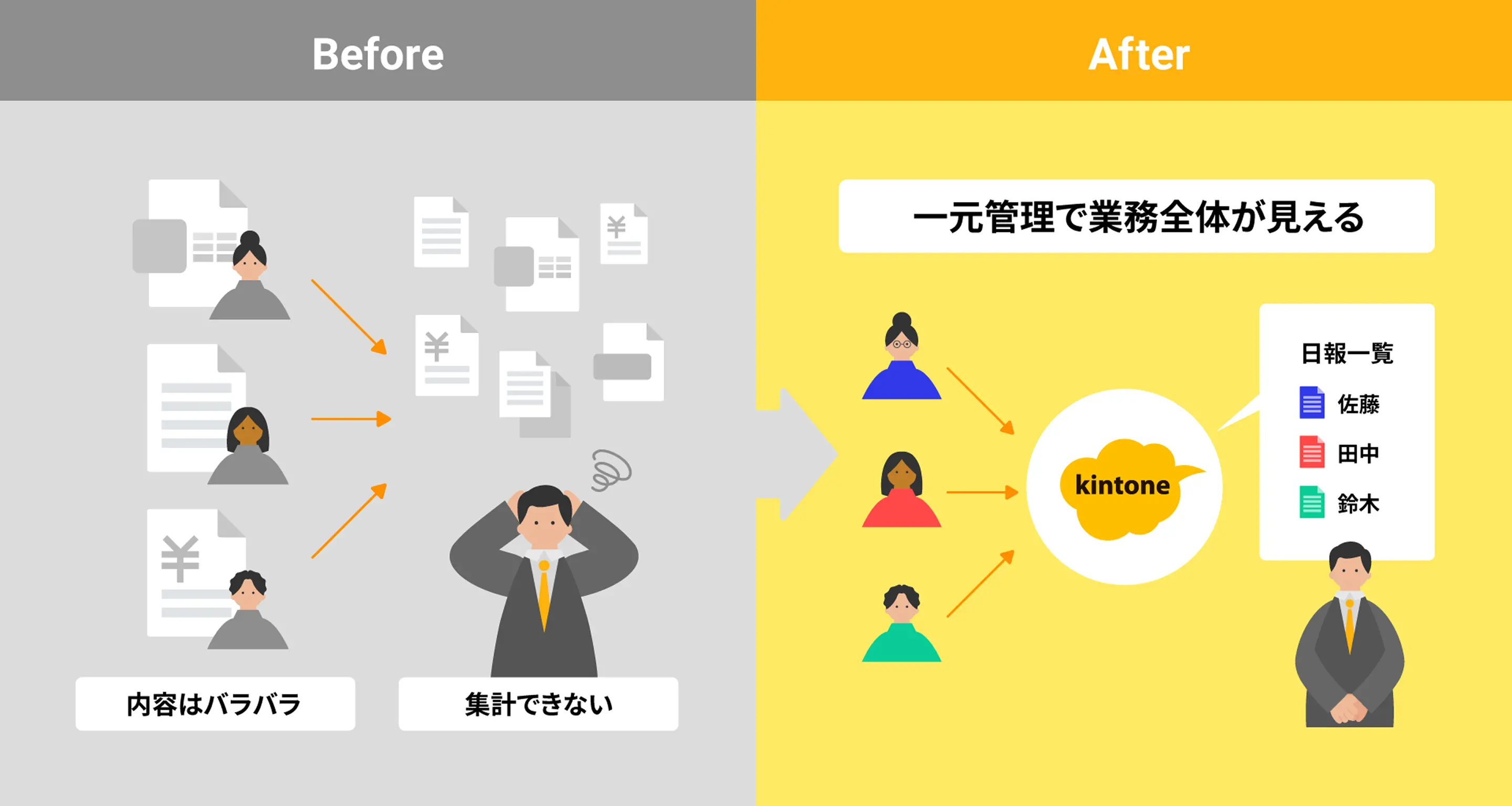 キントーンなら統一したフォーマットで情報が一箇所に集まり、業務全体を見える化できます。