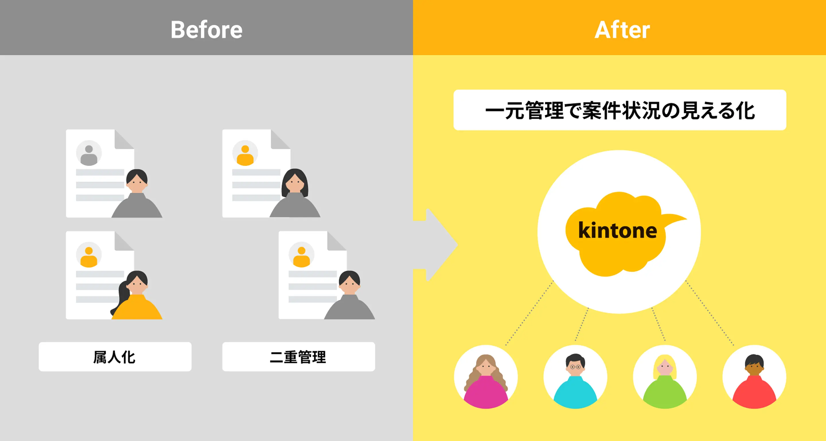 顧客や案件のデータをキントーンに集約できるので、情報を一元管理できます。案件の進捗を見える化し、二重対応や対応漏れを防ぎます。