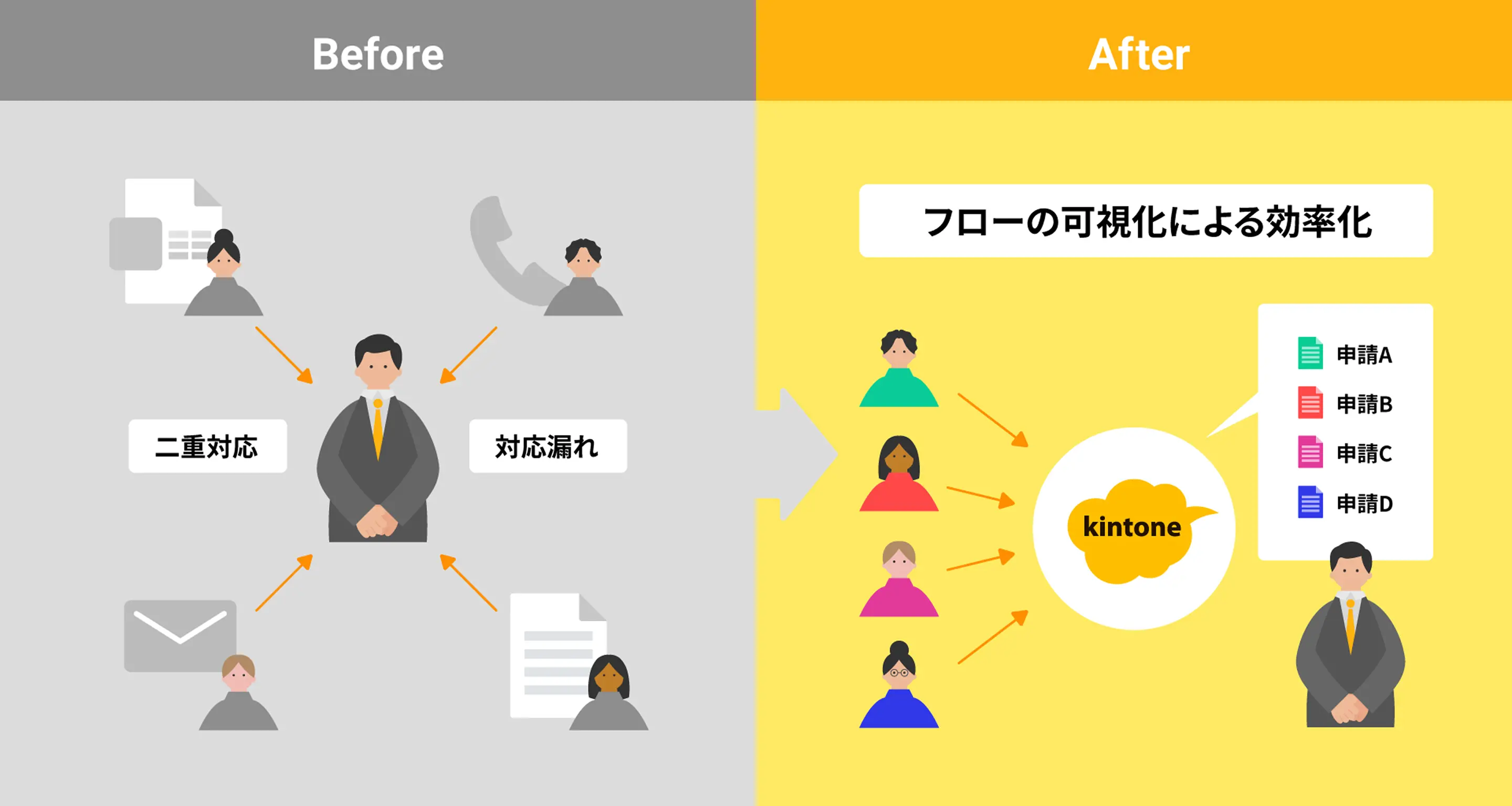 Excel、メール、FAXで来る申請をキントーンに集約することで、申請フローが見える化し、処理漏れがなくなります。