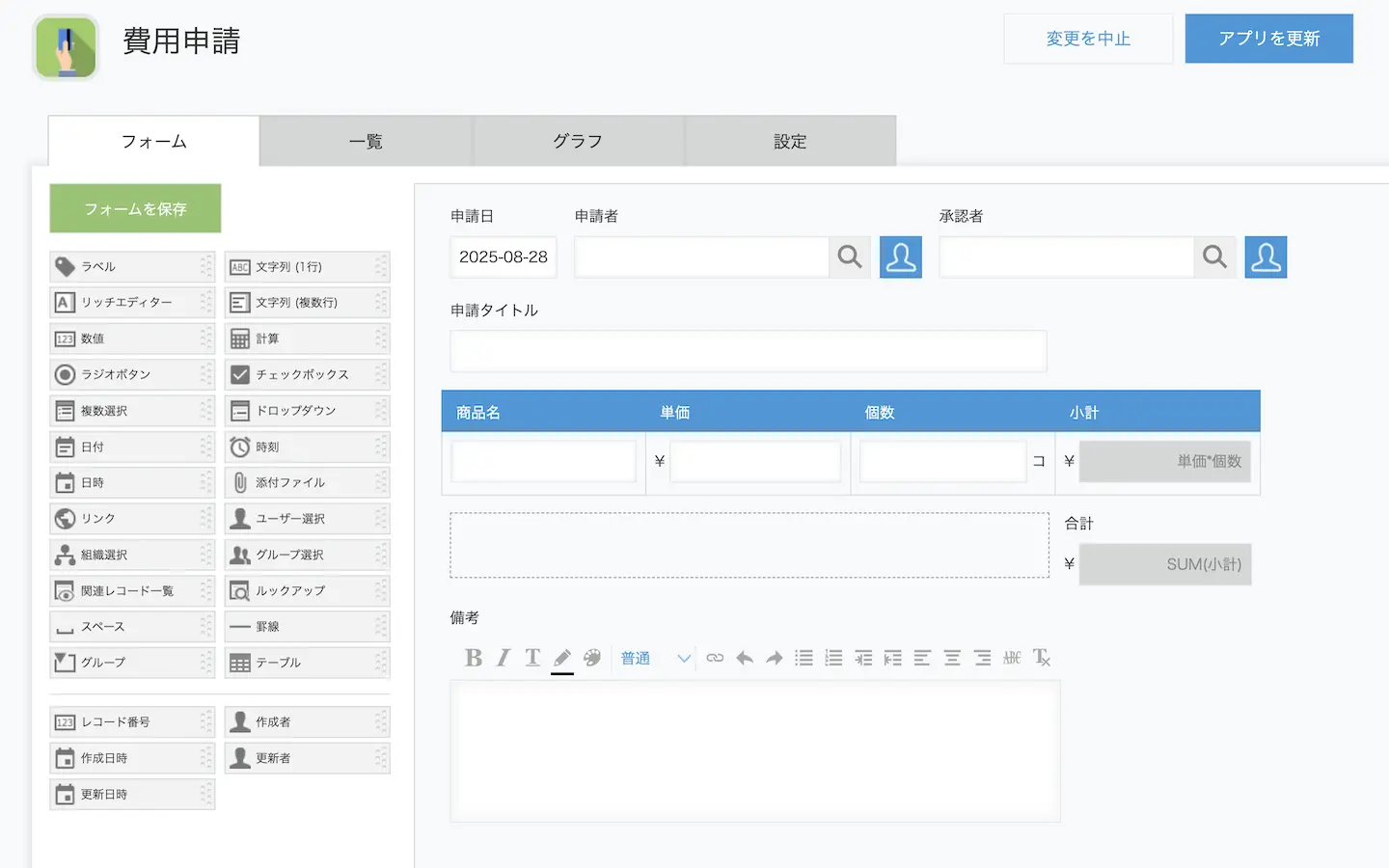 - 「交通費申請」「備品購入申請」「有給申請」など自社の業務に合わせた業務アプリをつくれます。