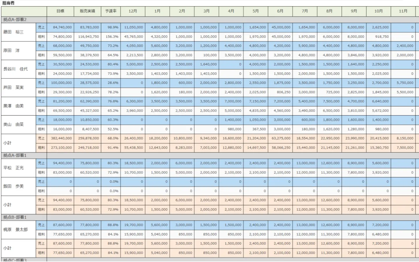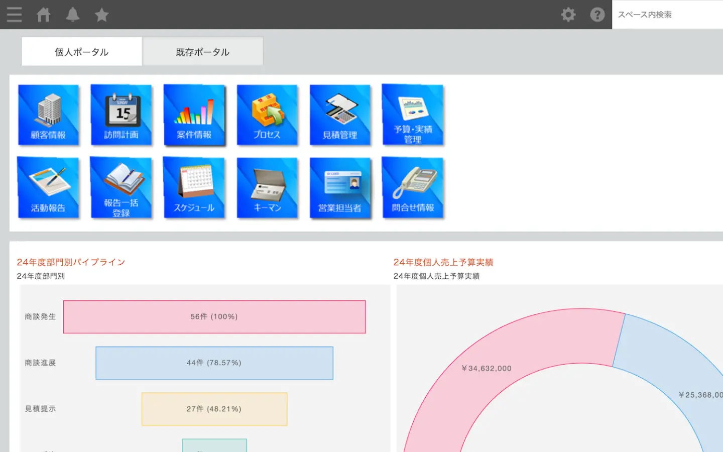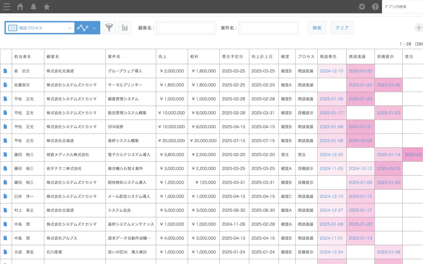 キントーン上で構築された、商談の進捗や売上・利益の見込みなどを管理・共有できるSFA・営業支援システムです。