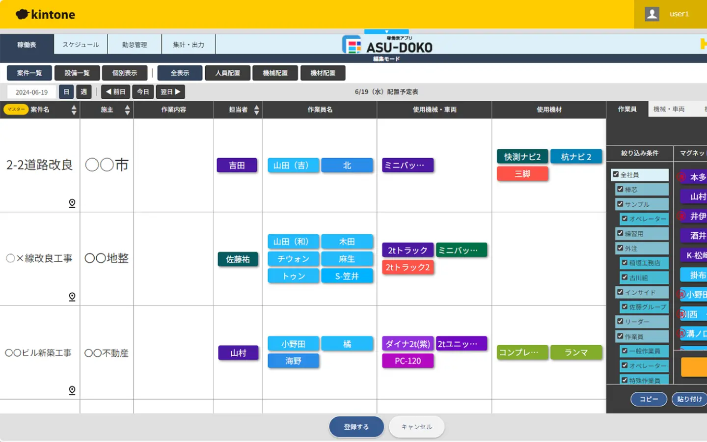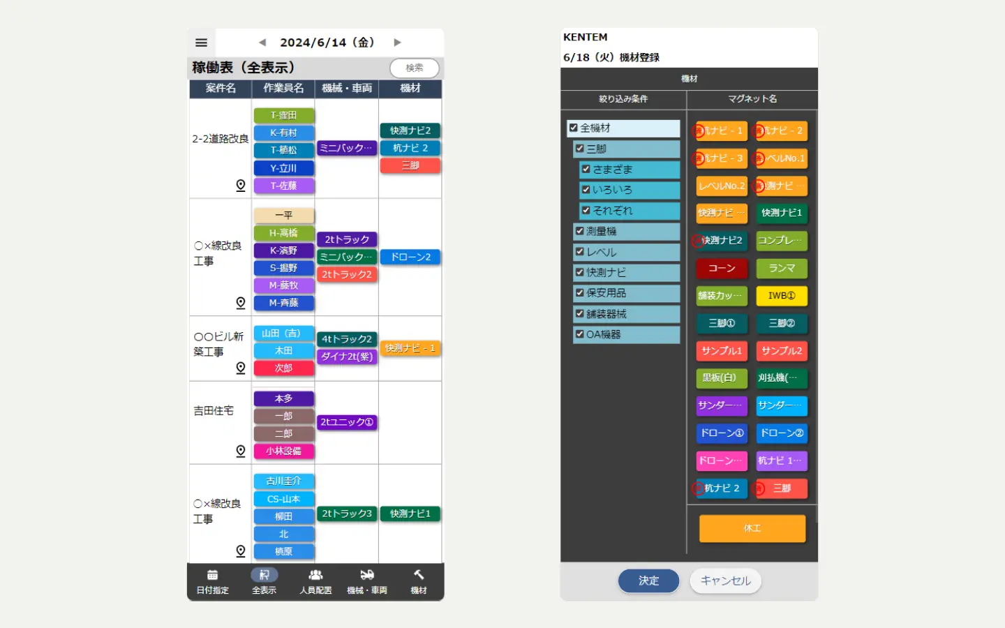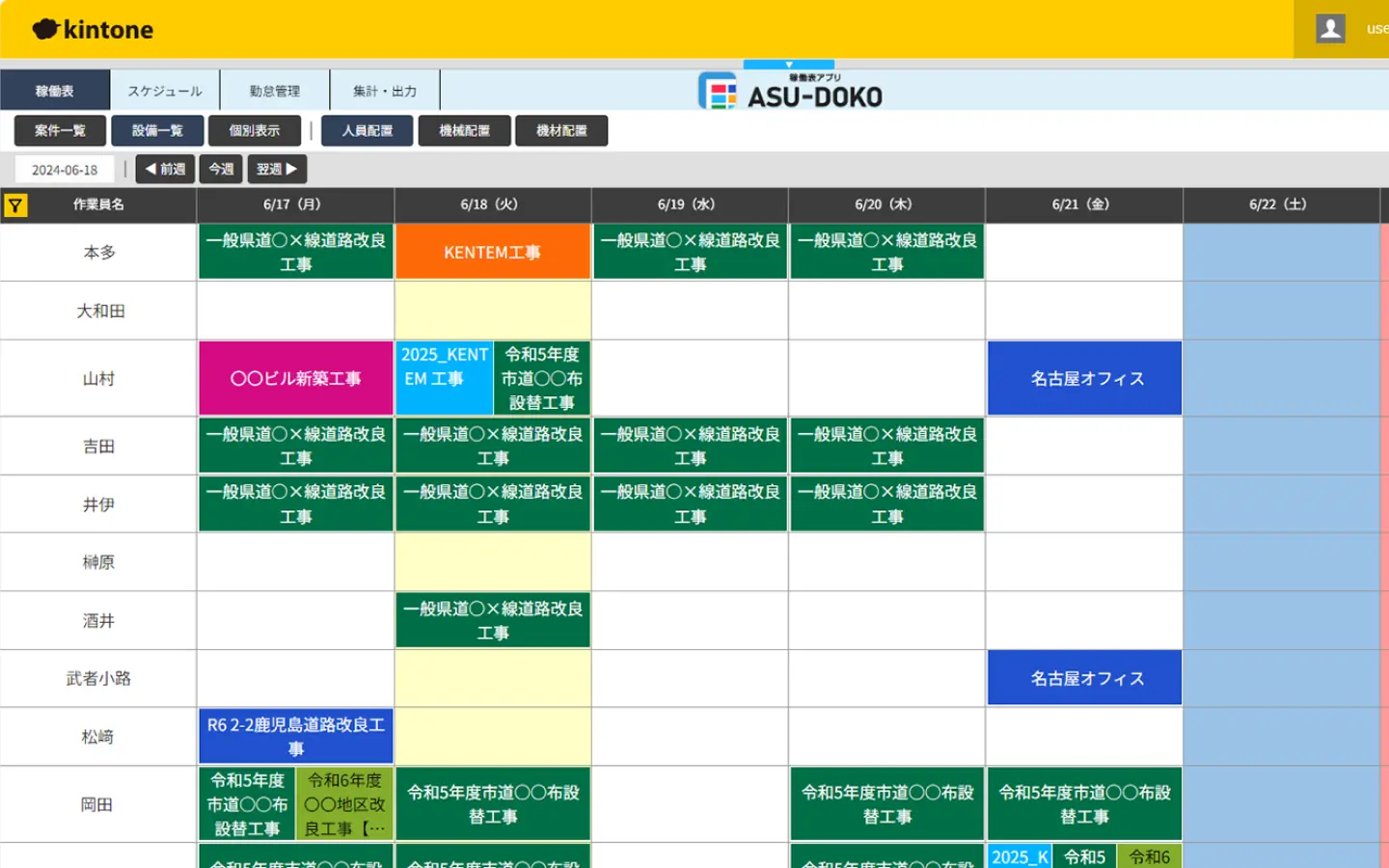 建設業のリソース配置計画が、マウス操作だけでかんたんに。配置計画の編集から共有・集計まで、いつでもどこでも行えます。