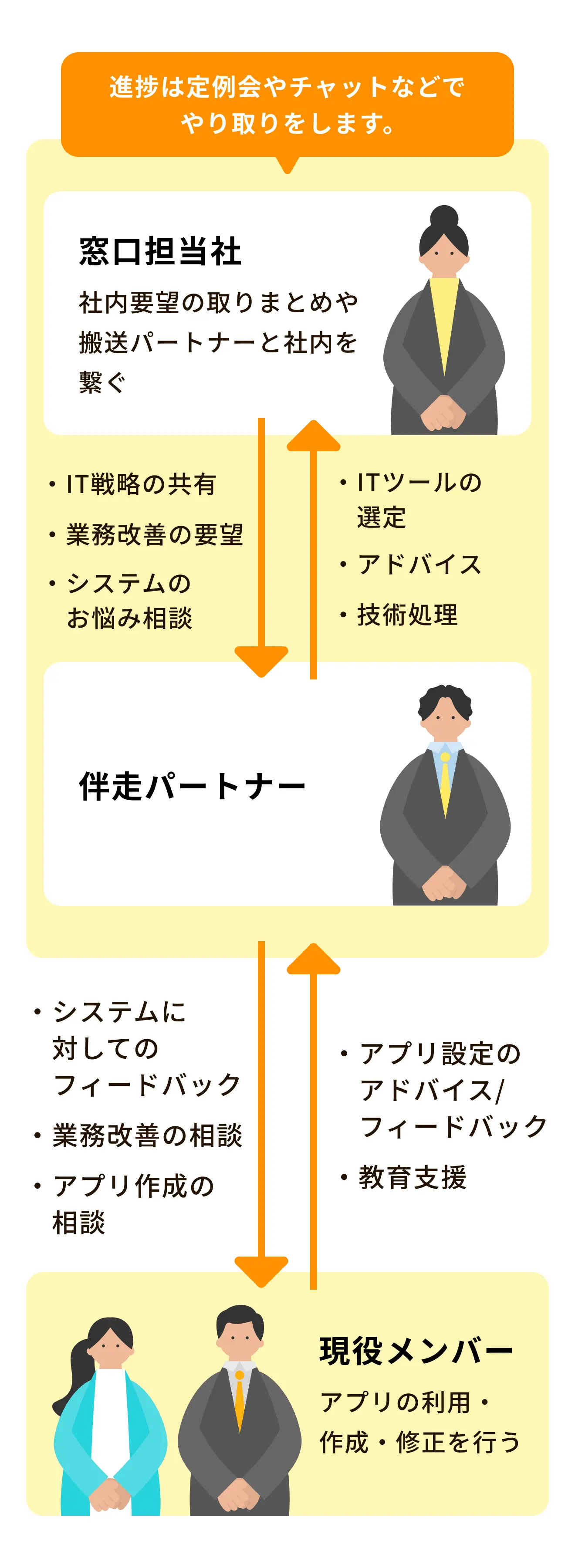 お客様と伴走パートナーで役割分担を行った上で、作成したアプリに対して伴走パートナーがフィードバックをしたり、運用相談を行うことができます。